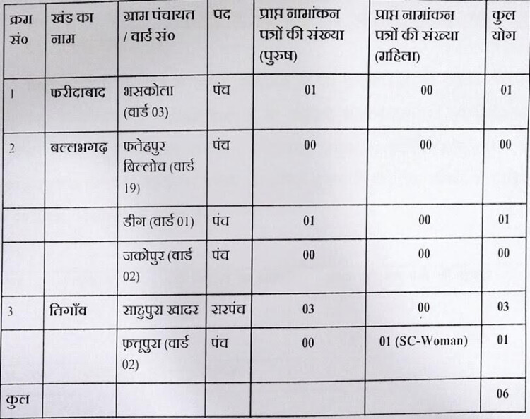 फरीदाबाद: पंचायती राज संस्थाओं के उप-चुनाव (अप्रैल–मई, 2026) के अंतर्गत जिला फरीदाबाद में नामांकन प्रक्रिया निर्धारित दिशा-निर्देशों के अनुसार सुचारू रूप से जारी है। उपायुक्त एवं जिला निर्वाचन अधिकारी (पंचायत) आयुष सिन्हा ने जानकारी देते हुए बताया कि आज दिनांक 24 अप्रैल 2026 को विभिन्न खंडों से प्राप्त नामांकन पत्रों की दैनिक रिपोर्ट राज्य निर्वाचन आयोग, हरियाणा को प्रेषित कर दी गई है। उन्होंने बताया कि खंड फरीदाबाद के अंतर्गत ग्राम पंचायत भरकोला (वार्ड-03) में पंच पद हेतु 01 नामांकन पत्र (पुरुष) प्राप्त हुआ है। खंड बल्लभगढ़ में ग्राम पंचायत फतेहपुर बिल्लोच (वार्ड-19) एवं जाकोपुर (वार्ड-02) में कोई नामांकन प्राप्त नहीं हुआ, जबकि ग्राम पंचायत डीग (वार्ड-01) में पंच पद के लिए 01 नामांकन पत्र (पुरुष) प्राप्त हुआ है।